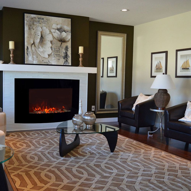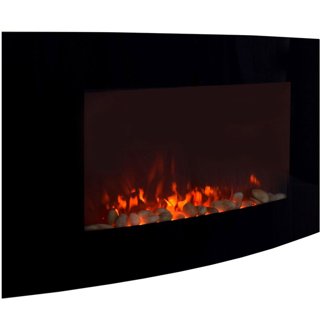 Der 2000 W starke Elektrokamin ist mit einer schwarzen, gebogenen Glasfront versehen. Es gibt keinerlei Ruß, keinerlei Staub und ist zudem absolut sicher.