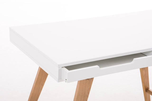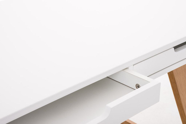 An dem Schreibtisch Porto lässt es sich sehr gut arbeiten. Nicht nur die große Arbeitsfläche bietet genug Platz, auch in den Schubladen haben Sie ausreichend Stauraum. Das harmonische Zusammenspiel der weiß lackierten Tischfläche aus MDF und den naturfarbenen Beinen aus Eichenholz verleiht jedem Wohnbereich ein ganz besonderes Flair. Ein stilvolles Design, was direkt ins Auge sticht.